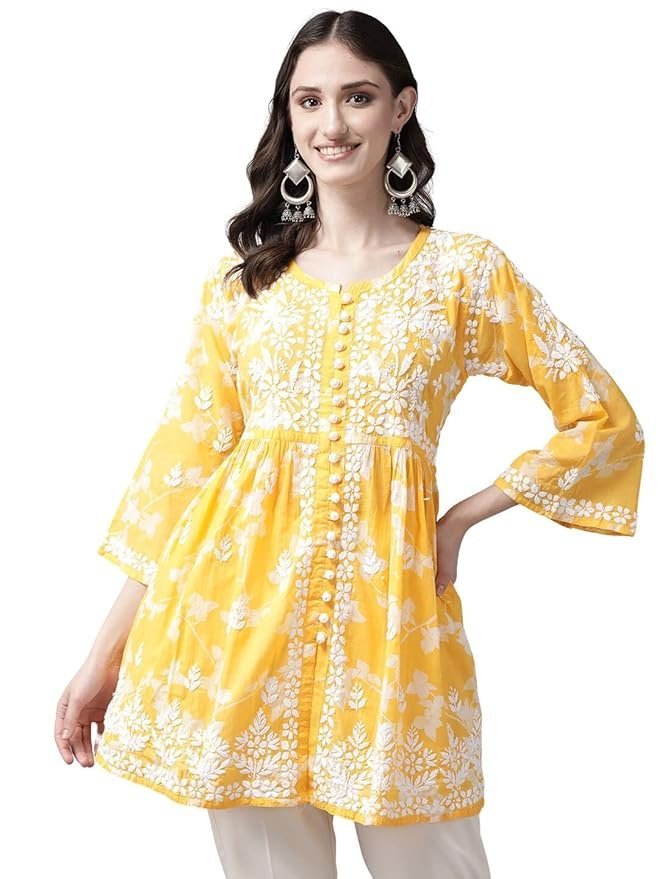 Ada Hand Embroidered Lucknow Chikankari Cotton Blend Floral Short Kurti Regular Fit Top Tunic For Women A911265