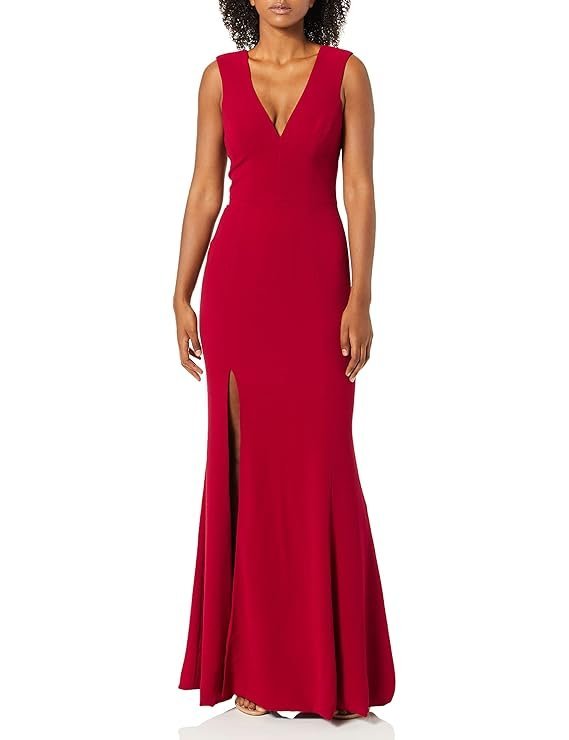 Dress the Population Women's Sandra Plunging Thick Strap Solid Gown With Slit Dress, Garnet, S