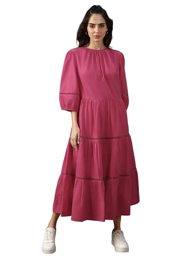 High Star Women Solid Cotton Flared Fit Round Neck Short Sleeve Dresses