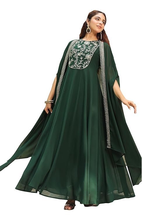 Janasya Women’s Dark Green Georgette Embroidered Anarkali Dress with Cape