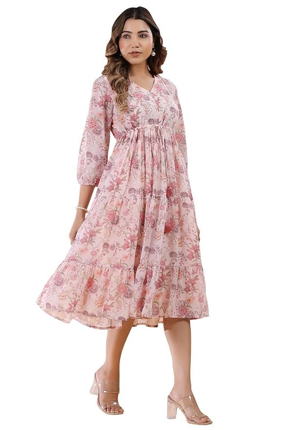 Janasya Women’s Pink Georgette Floral Printed Tiered Dress