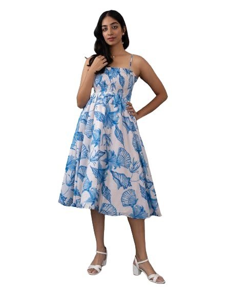 ONE Double Women’s Printed Midi Dress 100% Cotton Sleeveless Detachable Straps Knee Length with Side Pocket Western Swirl Dress