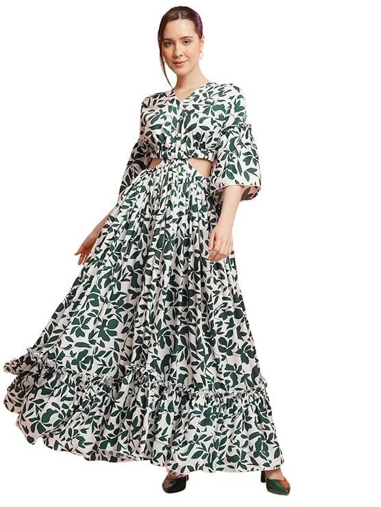 UK URBAN KOMFORT Women Stylish Cutwork Printed Design Puff Sleeve One Piece Layered Long Dress