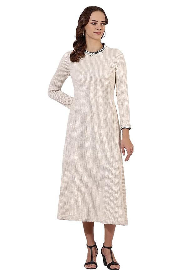 - Product description: This ecru W dress features a high neck, full sleeves, and an A-line silhouette. Crafted from a rayon blend with a yarn-dyed pattern, it offers a fusion style perfect for casual wear.